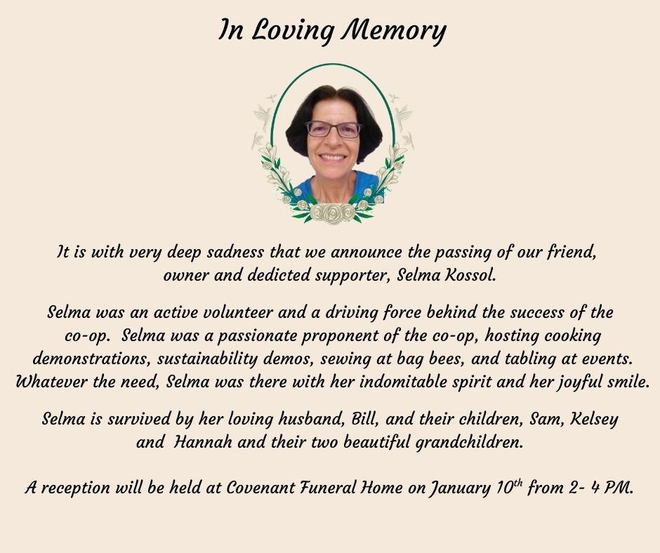 It is with very deep sadness that we share the passing of our friend, owner, and dedicated supporter, Selma Kossol. Selma was an active volunteer and a driving force behind the success of the Fredericksburg Food Co-op. She was a passionate proponent of the co-op,...